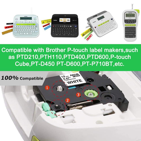 12 x Aken Compatible con Brother TZe-231 TZe231 12 mm 0,47 Cinta para Etiquetado, Cinta Laminada Negra y Blanca para Brother Ptouch H100LB H107B P300BT D400 P710BT Cube